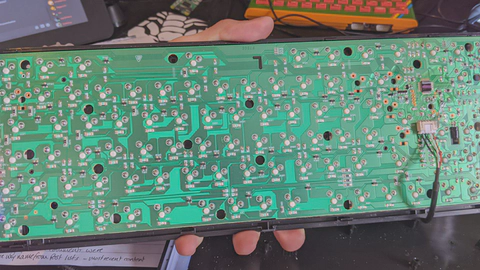 If you need to remove a keyswitch, a soldering iron is needed. Fortunately I didn’t need to. I was about to go and get mine to swap the evidently faulty “Enter” key for another key I never pressed like “Break” or “Scroll Lock” but after poking the PCB a bit I noticed a random blob of soldersitting between the Enter key and some other trace.
