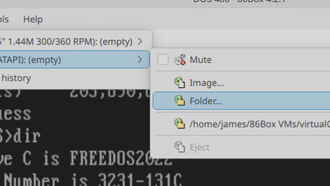 Note that the virtual CDROM is literally read only, you can’t copy files into it from DOS. And you can’t update the files inside it from the host without “ejecting” and reinserting the virtual CD.