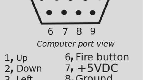 The joystick was a very simple device, having nothing more than five switches inside it; the good ones used microswitches, the less-good ones used mushy leaf springs or pieces of metal that pressed together. On the end of the cable was a 9 pin d-sub connector wired like this